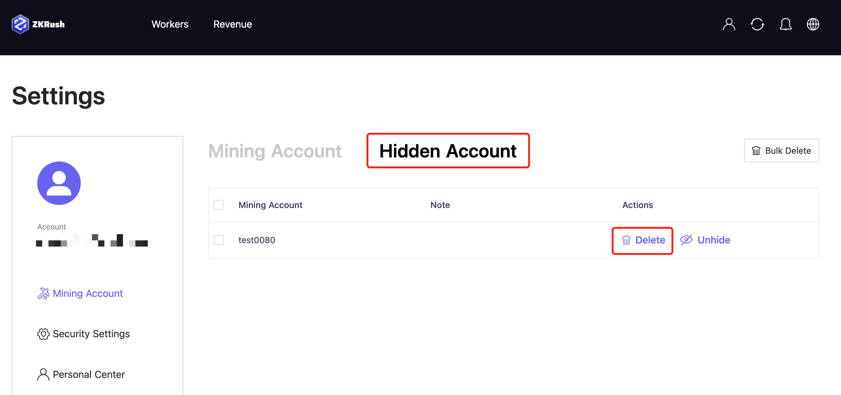 > ***⚠️ Once deleted, the mining accounts along with the records will be permanently erased and cannot be recovered. Same username cannot be registered again, please proceed it with caution.***